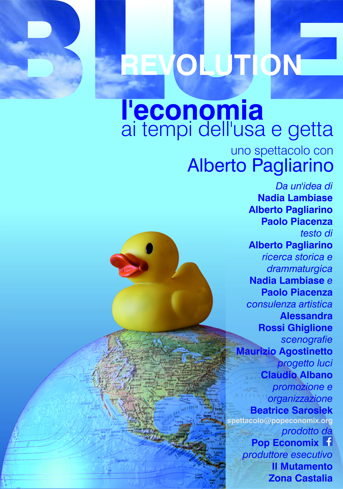 Nato da un’idea di Nadia Lambiase, Alberto Pagliarino e Paolo Piacenza, e con lo stesso Alberto Pagliarino come protagonista sul palco, Blue revolution è prodotto da Pop Economix e Il Mutamento Zona Castalia (produttore esecutivo). Pop Economix è il nome di un’associazione che ha l’obiettivo di coinvolgere il pubblico sui temi complessi dell’economia e delle sue implicazioni sulla vita di ciascuno, stimolandolo a informarsi e ad assumere un atteggiamento critico e responsabile nei confronti delle diverse scelte possibili. Ma è anche il nome di uno spettacolo dal 2011 ha cercato di raccontare, attraverso il teatro, la crisi economica globale esplosa dopo il fallimento di Lehman Brothers. Dopo le oltre 300 repliche in giro per l’Italia (e non solo), arriva ora Blue revolution.